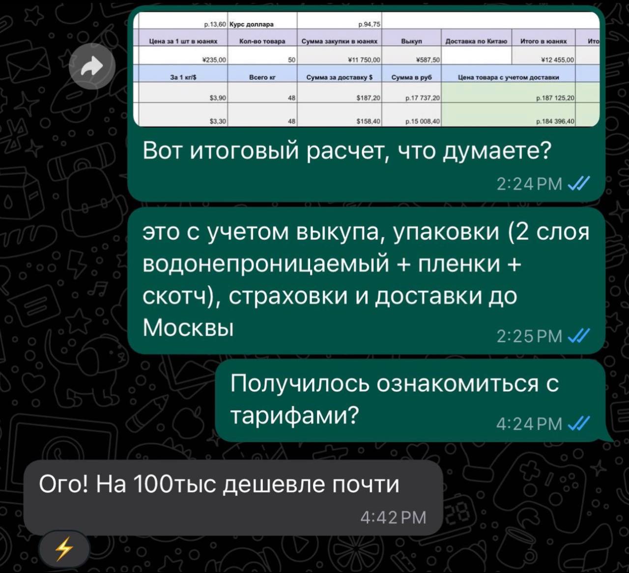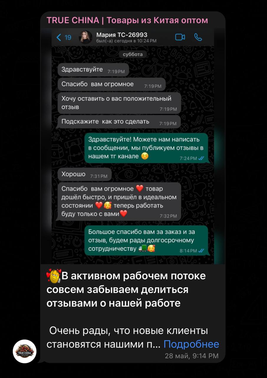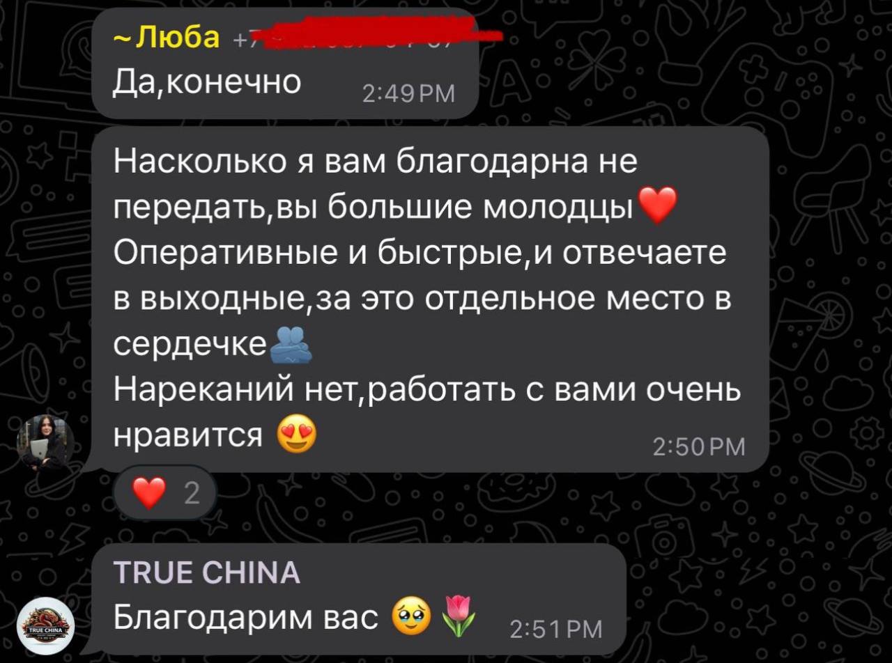 • Мы прямые поставщики, а не посредники Мы отвечаем за качество всего процесса: от выкупа до получения товара клиентом. А также у нас есть собственный ФФ прямо в Китае.